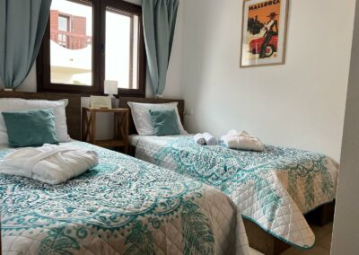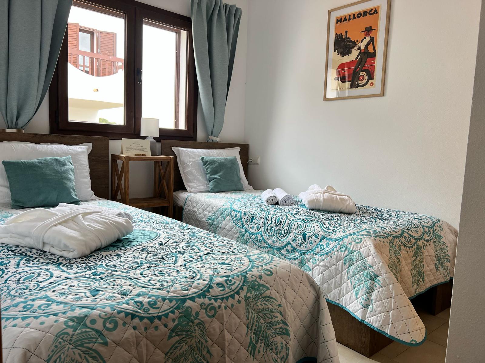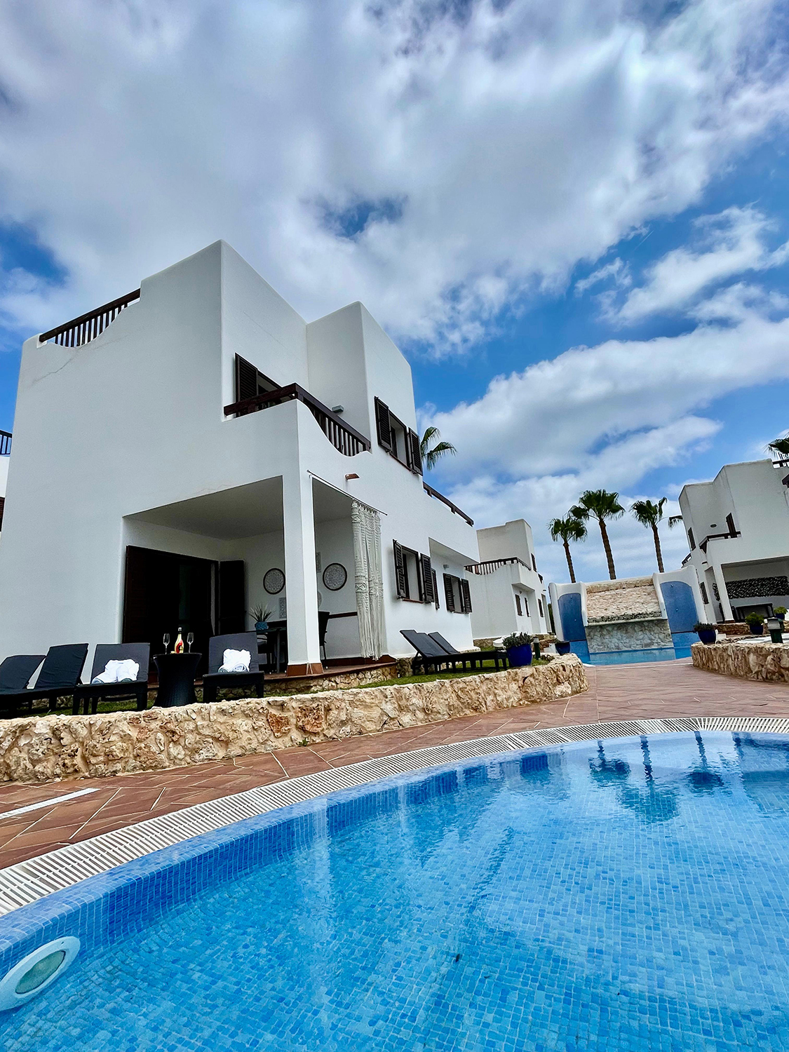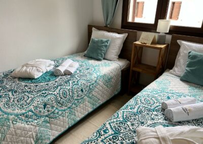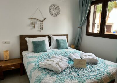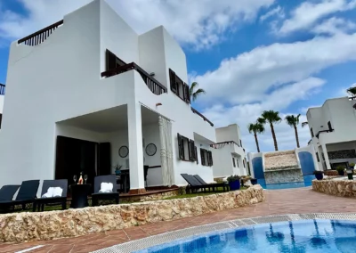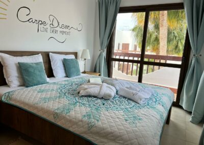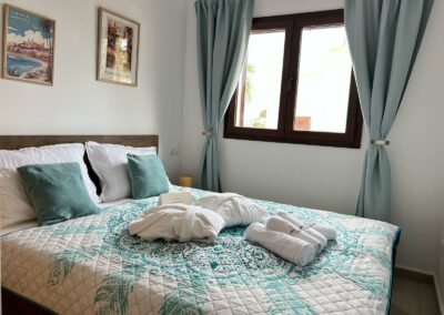 V přízemí jsou dvě ložnice ideální pro rodinu – jedna s manželskou postelí a druhá se dvěma lůžky. V patře najdete prostornou ložnici s výhledem na palmy, další ložnici s manželskou postelí a pokoj s rozkládací pohovkou pro dva.