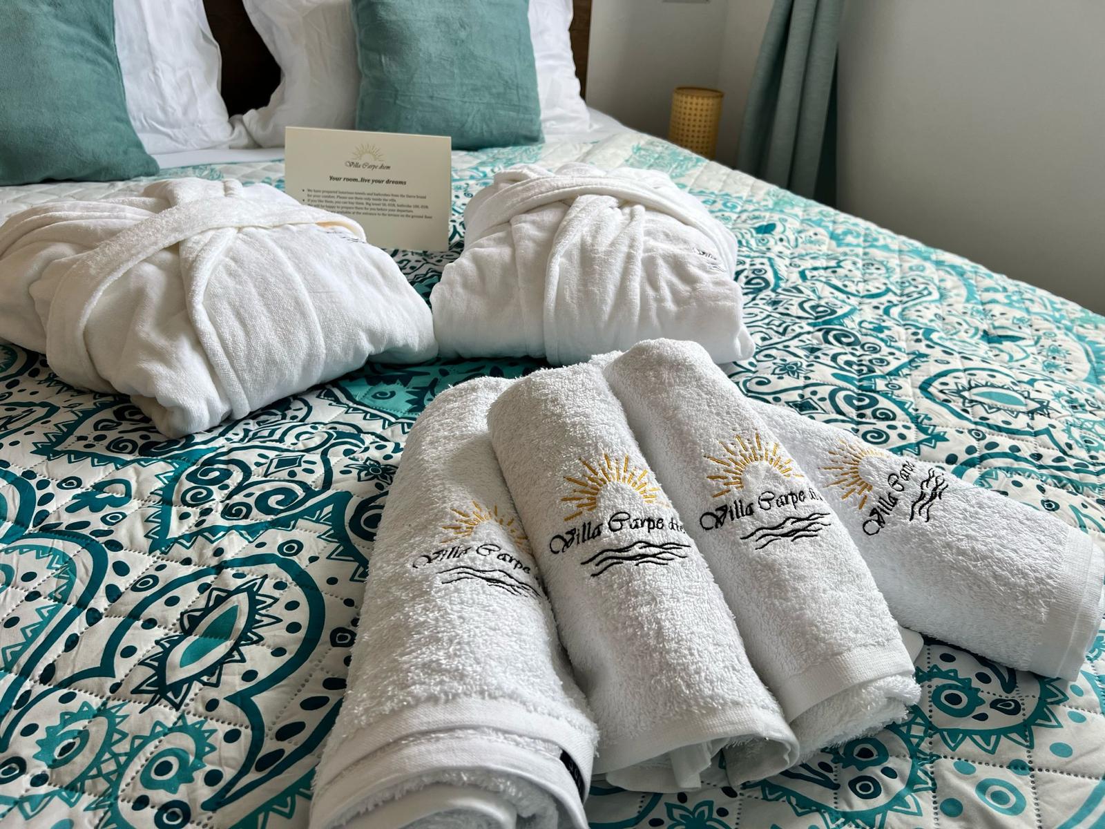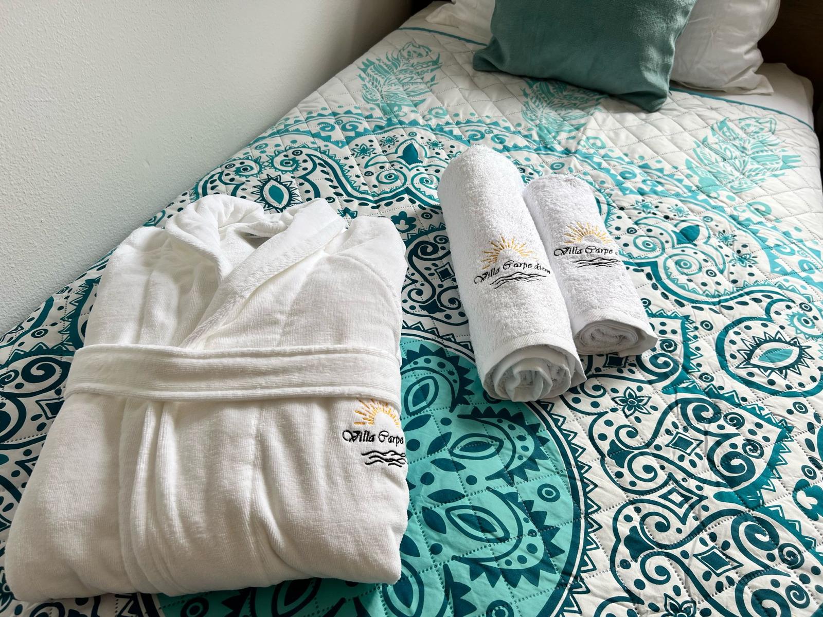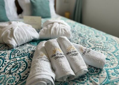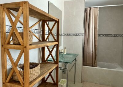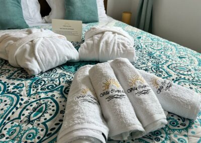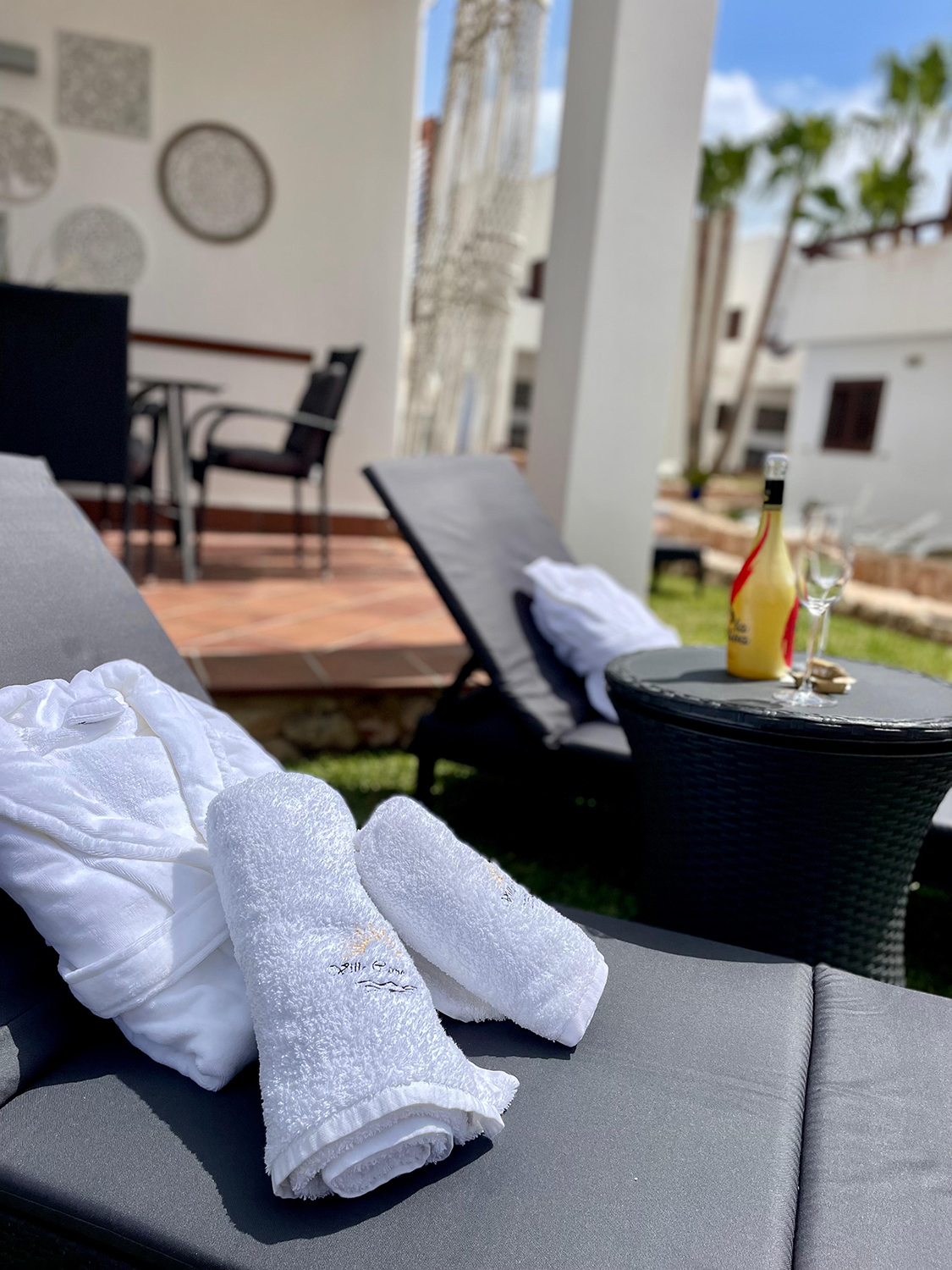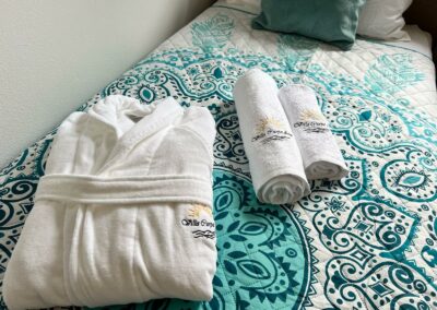 Každé patro má vlastní koupelnu s vanou, toaletou a je vybaveno kvalitním fénem a kosmetikou s osobitou vůní Mallorky. Pro Váš komfort jsou připraveny ručníky, župany z vlastní edice Carpe diem od firmy Darré. Osušky na pláž jsou Vám také plně k dispozici.