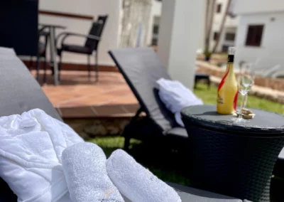 Prostorná útulná zahrada je vhodná jak k relaxaci na pohodlných lehátkách, tak k aktivnímu odpočinku.