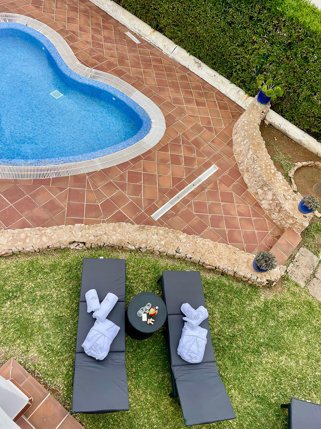 Venku má vila vlastní nádhernou zahradu s výhledem na dva bazény (hlavní bazén s kaskádovitým vodopádem) s lehátky a grilem. K dispozici je další jídelní stůl na venkovní terase, kde si můžete co nejvíce užít stolování během mallorského slunečního svitu.